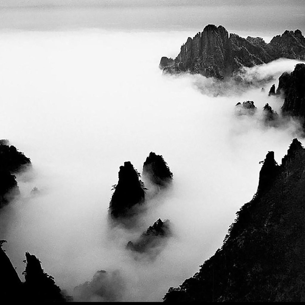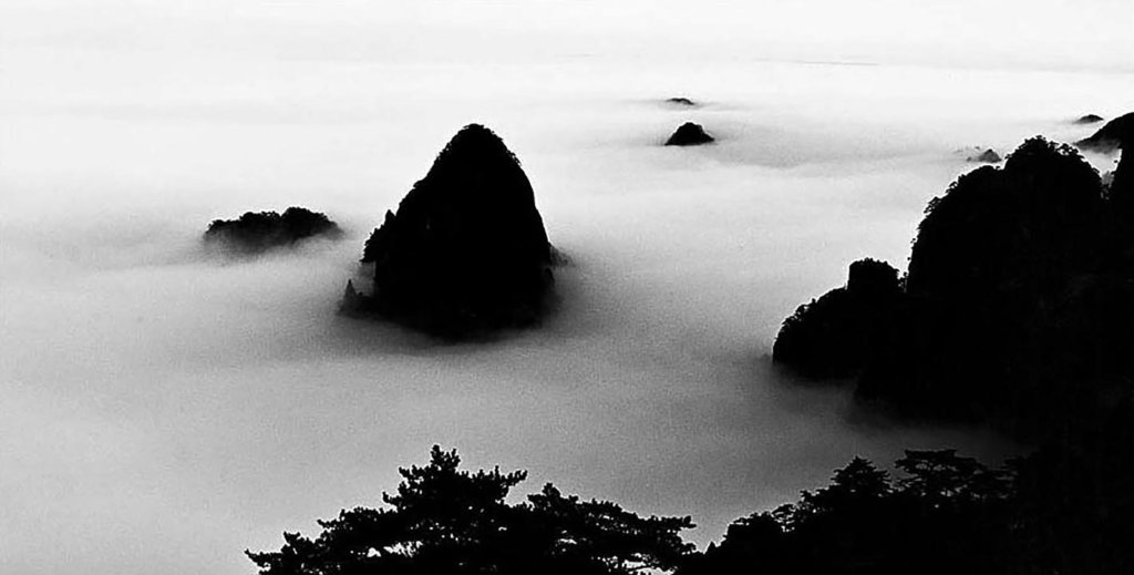 「私は再び眼前に神韻を帯びた黄山の光景が次々に浮かび上がるのを感じた。白黒のフィルムによる撮影に、中国古来の水墨画の持つ深い味わいに通じるものが表れている/東山魁夷」